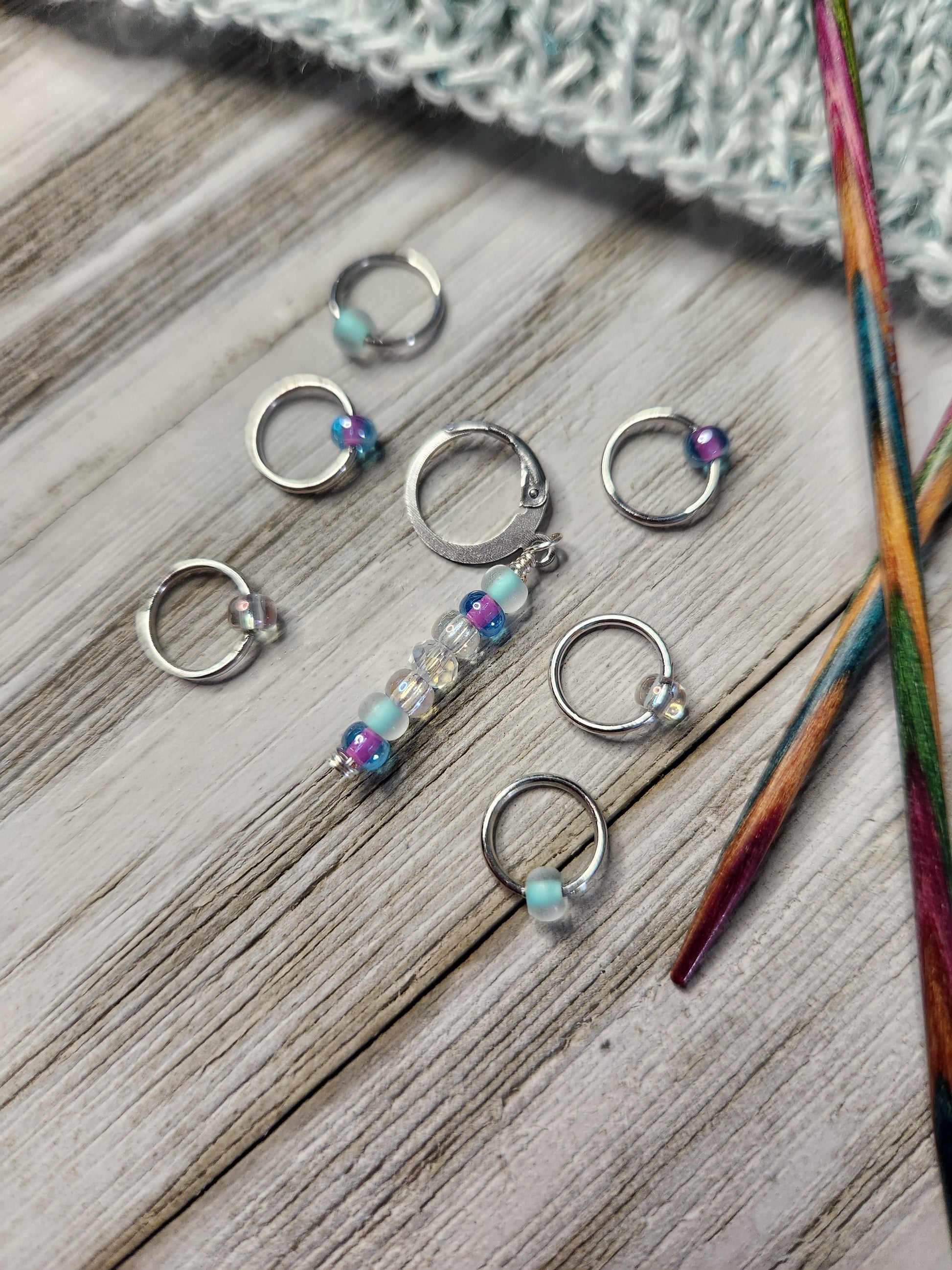 Set of 6 round snag free stitch markers and one progress keeper.